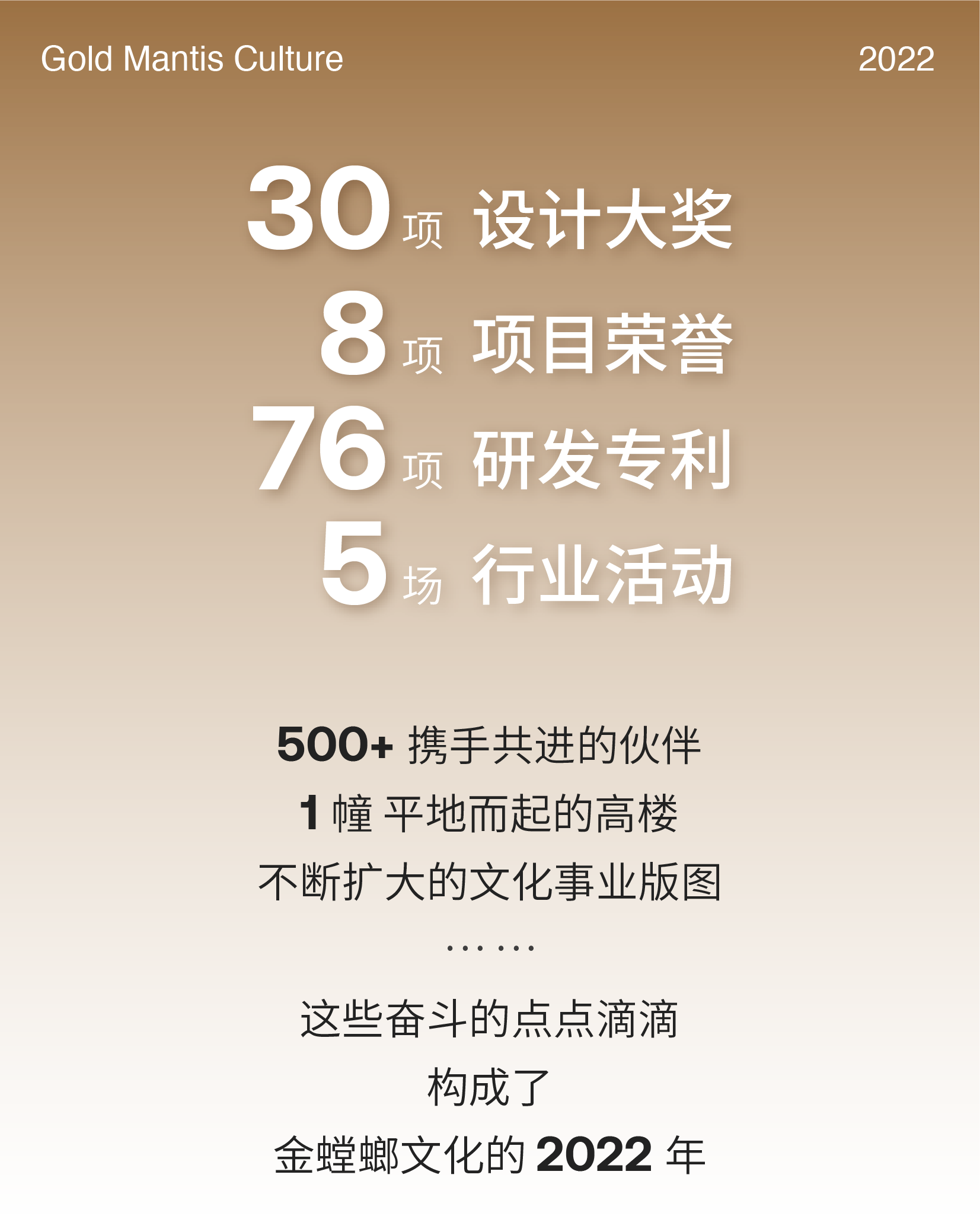 從江南水鄉到三秦大地,金螳螂文化詮釋空間故事,打造了數十個全國及各省市重點文化項目,收獲了近40個設計、施工類獎項,得到了業主認可,塑造了“創新質造”的行業口碑。 5·18 國際博物館日,2021年度全國博物館十大陳列展覽精品終評結果公布。 金螳螂文化參與設計施工的“揚州中國大運河博物館常設展覽”喜獲第十九屆(2021年度)全國博物館十大陳列展覽精品獎! 常熟市沙家浜革命歷史紀念館改陳布展項目獲得2021-2022年度中國建筑工程裝飾獎。 溧陽生態創新展示館獲得2022年度建筑裝飾行業科學技術獎科技創新工程獎。 中國建筑裝飾設計獎、美國IDA設計大獎、加拿大GPD設計大獎……金螳螂文化項目的影響力不斷擴大,在實現企業價值增長的同時弘揚優秀中華文化,讓文化會說話。 讓設計更有文化,讓空間更有故事。 多年來,金螳螂文化持續深度探索文化行業,積極推動行業相關標準的編制,推動校企合作,推進產學研共建,愿做文化行業探索者。 努力會被看見,優秀會得到嘉獎,金子終將閃閃發光。 在不完美的現實中,金螳螂文化人發現美,創造美,共同繪就文化的未來。 2022 這一年 我們銳意進取,榮耀相隨 在嶄新的 2023 年 愿突破想象,逐新再創 并肩前行,大展宏“兔” 共筑文化行業的未來!